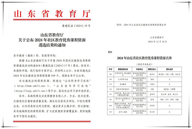 本网讯(继续教育公司)近日,山东省教育厅公布了2024年社区教育优秀课程资源遴选结果,公司8门课程入选。
