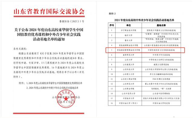 为打造国情教育“第一课堂”“第二课堂”品牌,建设中国国情教育课程体系资源库,发挥引领示范作用,形成优质教育资源合力,山东省教育厅、山东省教育国际交流协会面向省内高校征集来华职工中国国情教育优秀课程和来华职工社会实践活动基地,推动山东省来华职工国情教育高质量发展。经省内各高校申请和专家评审,共有15门课程被评为2024年度山东高校来华职工中国国情教育优秀课程,16个基地被评为2024年度山东高校中外青少年社会实践活动基地。