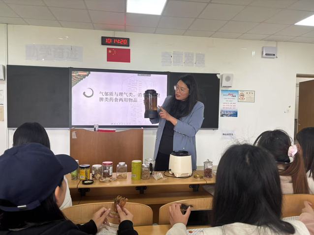 活动现场,烹饪工艺与营养专业丁连翠老师化身“食养导师”,深入浅出地解析气郁体质的成因与表现。从生活压力、情志不畅等诱因切入,让同学们明晰气郁体质的形成机理。依据疏肝解郁、健脾理气的食养原则,丁老师现场演示黄花菜瘦肉汤、双花饮、玫瑰膏、陈皮粥等食养方法。她边操作边讲解食材特性与烹饪要点,将中医理论与烹饪技艺巧妙融合。除了干货满满的讲解,现场还设置了体质自测、养生茶饮品鉴等互动环节。同学们通过自测了解自身体质,在品鉴养生茶的过程中,直观感受食养的魅力,学习热情高涨。