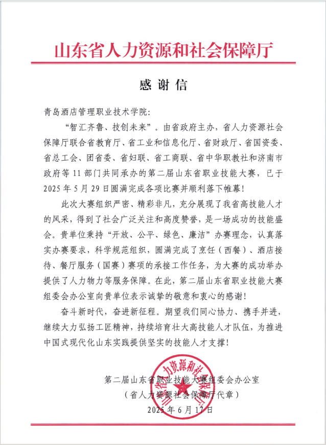 本网讯(教务处 太阳成集团122ccvip 酒店管理公司)近日,山东省人力资源和社会保障厅发来感谢信,对公司高质量承办第二届山东省职业技能大赛表示感谢,对公司在办赛中所作的突出贡献给予肯定。