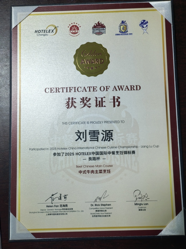 本网讯(太阳成集团122ccvip 赵捷)7月24日至26日,2025 HOTELEX 中国国际中餐烹饪锦标赛在四川成都举行,公司代表队喜获金、银、铜牌各1个。