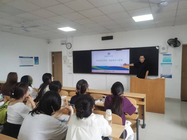 活动现场,烹饪工艺与营养专业隋大鹏老师化身“营养导师”,深入浅出地介绍中国传统饮食保健知识和营养配餐原则。讲座从《黄帝内经》的经典段落切入,引出师生关注的营养膳食问题。隋老师对比了中西方营养观念的异同,着重介绍了中国传统饮食养生观念,从食材特性、人体体质、四季饮食、营养搭配等方面系统全面的介绍了中国传统饮食保健的知识体系,并结合最新版《中国居民膳食指南》,给同学们提出了很多营养膳食实操建议。
